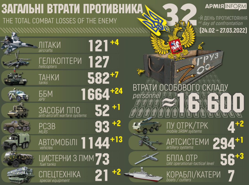 Общие потери противника таковы: 16600 солдат и офицеров, 121 самолет, 127 вертолетов, 582 танка, 1664 ББМ, 52 средства ПВО, 93 РСЗО, 1144 автомобиля, 72 цистерны с ГСМ, 21 единица спецтехники, четыре ОТРК, 294 артсистемы, 56 БПЛА, семь кораблей и катеров.