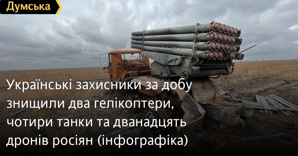 Два гелікоптери, чотири танки та дванадцять дронів російських нацистів знищили за минулу добу Сили оборони України.