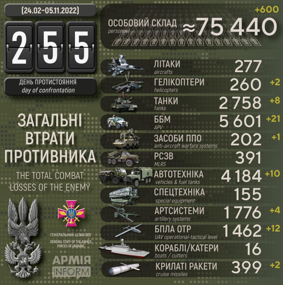 особового складу ‒ близько 75 440 (+600) осіб ліквідовано,