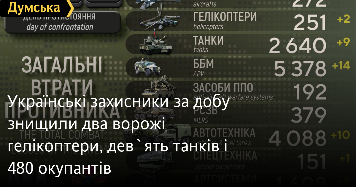 480 осіб, дев'ять танків і два гелікоптери втратили окупанти в Україні за минулу добу.