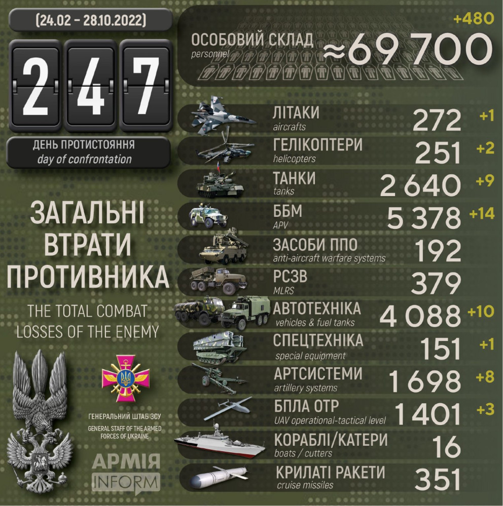 Крім того, за даними Генерального штабу Збройних сил України, наші захисники також знищили 14 бойових броньованих машин, вісім артсистеми, один літак, три БПЛА оперативно-тактичного рівня, десять одиниць автомобільної техніки і одну одиницю спецтехніки.