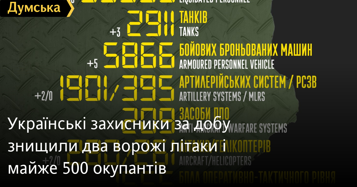 Українські захисники за добу знищили два ворожі літаки і майже 500 окупантів480 осіб, три танки та два літаки втратили окупанти в Україні за минулу добу. Крім того, за даними Генерального штабу Збройних сил України, наші захисники також знищили п'ять бойових броньованих машин, дві артсистеми і сім одиниць автомобільної техніки. Усього з початку повномасштабного вторгнення втрати ворога склали: особового складу — 88 380 осіб; танків ‒ 2911одиниць; бойових броньованих машин ‒ 5866 одиниць; артилерійських систем – 1901 одиницю; РСЗВ — 395 одиниць; засоби ППО ‒ 209 одиниць; літаків – 280 одиниць; гелікоптерів – 261 одиницю; БПЛА оперативно-тактичного рівня – 1555; крилаті ракети ‒ 531; кораблі /катери ‒ 16 одиниць; автомобільної техніки та автоцистерн – 4423 одиниці; спеціальна техніка ‒ 163. СМЕРТЬ РОСІЙСЬКИМ ОКУПАНТАМ! Помітили помилку? Виділяйте слова з помилкою та натискайте control-enter |