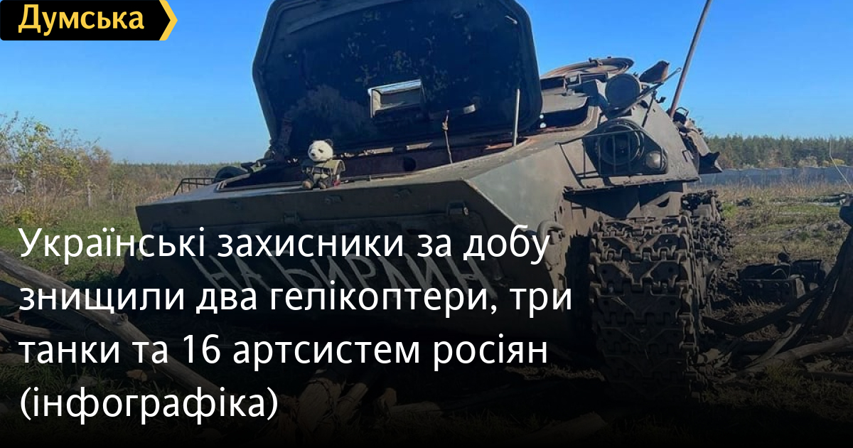 Два гелікоптери, три танки та 16 артсистем російських нацистів знищили за минулу добу Сили оборони України.