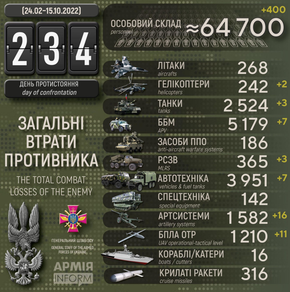 особового складу ‒ близько 64700 (+400) осіб ліквідовано,