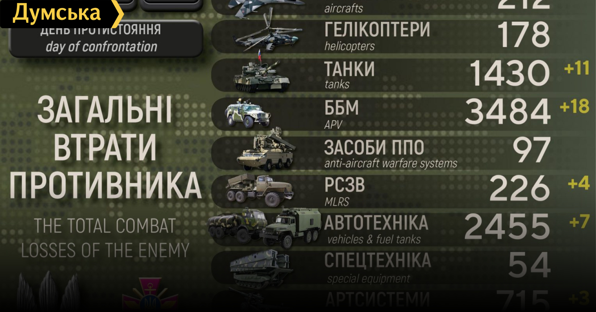 Украинские защитники за сутки уничтожили одиннадцать вражеских танков, четыре реактивные системы залпового огня и три беспилотникаСилы обороны уничтожили одиннадцать российских танков, четыре реактивные системы залпового огня и три беспилотника оперативно-тактического уровня. Около 100 российских нацистов убиты или в плену. Кроме того, как сообщает Генштаб Вооруженных сил, оккупанты потеряли в Украине 18 боевых бронированных машин, семь автомобилей и автоцистерн и три артсистемы. Всего с начала полномасштабного вторжения потери врага составили: личного состава ‒ 32150 (+100) человек ликвидировано, танков ‒ 1430 (+11), боевых бронированных машин ‒ 3484 (+18), артиллерийских систем – 715 (+3), РСЗО ‒ 226 (+4), средства ПВО ‒ 97, самолетов ‒ 212, вертолетов ‒ 178, БПЛА оперативно-тактического уровня – 582 (+3), крылатые ракеты ‒ 125, корабли /катера ‒ 13, автомобильной техники и автоцистерн ‒ 2455 (+7), специальная техника – 54. Наибольшие потери противник понес на северодонецком и бахмутском направлениях. Данные уточняются. СМЕРТЬ РОСІЙСЬКИМ ОКУПАНТАМ! Помітили помилку? Виділяйте слова з помилкою та натискайте control-enter |