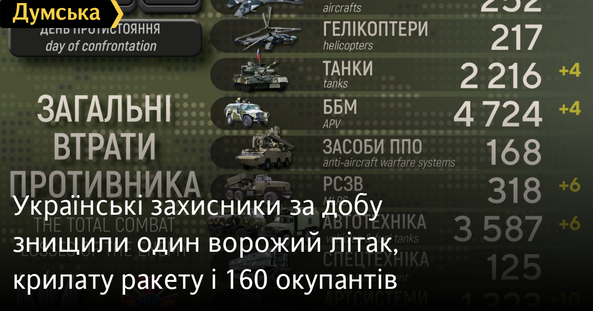 160 осіб, один літак Су-25 і чотири танки втратили окупанти за минулу добу в Україні.