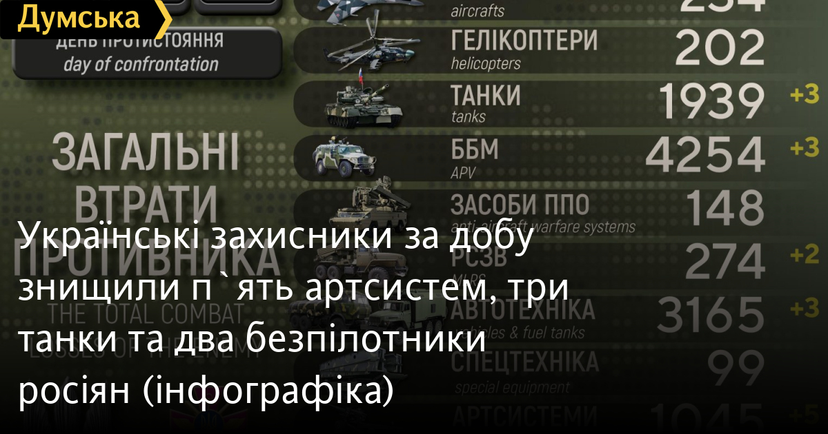 Всього з початку повномасштабної війни українські захисники знищили приблизно: особового складу ‒ близько 46 500 (+250) осіб, танків ‒ 1939 (+3) од, бойових броньованих машин ‒ 4254 (+3) од, артилерійських систем – 1045 (+5) од, РСЗВ ‒ 274 (+2) од, засоби ППО ‒ 148 (+0) од, літаків – 234 (+0) од, гелікоптерів – 202 (+0) од, БПЛА оперативно-тактичного рівня ‒ 836 (+2), крилаті ракети ‒ 196 (+0), кораблі / катери ‒ 15 (+0) од, автомобільної техніки та автоцистерн ‒ 3165 (+3) од, спеціальна техніка ‒ 99 (+0).