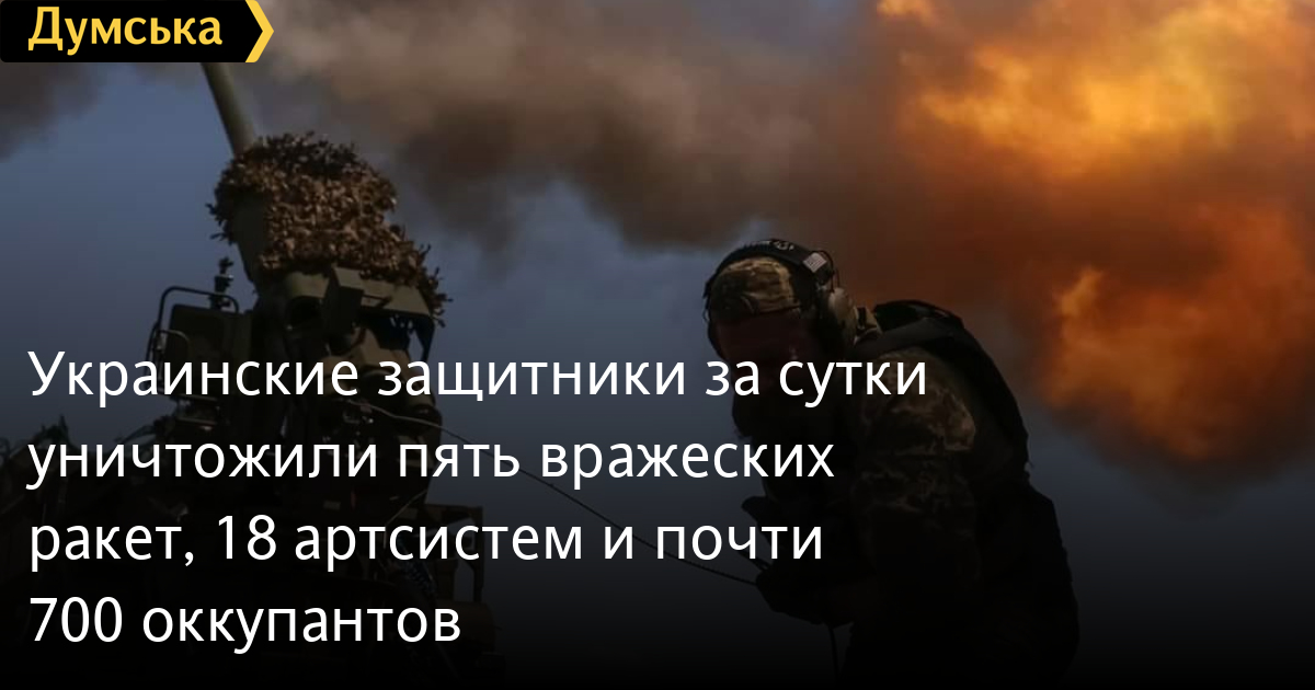 Українські захисники за добу знищили п`ять ворожих ракет, 18 артсистем і майже 700 окупантів680 осіб, п'ять крилатих ракет і чотири танки втратили окупанти в Україні за минулу добу. Крім того, за даними Генерального штабу Збройних сил України, наші захисники також знищили 15 бойових броньованих машин, 18 артсистем, сім засобів ППО, 15 БПЛА оперативно-тактичного рівня, 11 одиниць автомобільної техніки і одну одиницю спецтехніки. Усього з початку повномасштабного вторгнення втрати ворога склали: особового складу — 240 690 осіб; танків ‒ 4133 одиниці; бойових броньованих машин ‒ 8080 одиниць; артилерійських систем – 4610 одиниць; РСЗВ – 692 одиниці; засоби ППО ‒ 440 одиниць; літаків – 315 одиниць; гелікоптерів – 310 одиниць; БПЛА оперативно-тактичного рівня – 3933; крилаті ракети ‒ 1298; кораблі /катери ‒ 18 одиниць; автомобільної техніки та автоцистерн – 7145 одиниць; спеціальна техніка ‒ 686. СМЕРТЬ РОСІЙСЬКИМ ОКУПАНТАМ! Помітили помилку? Виділяйте слова з помилкою та натискайте control-enter |