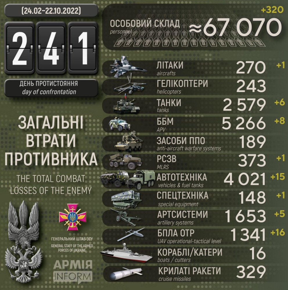 Всього з початку повномасштабної війни українські захисники знищили приблизно: особового складу ‒ близько 67070 (+320) осіб ліквідовано,