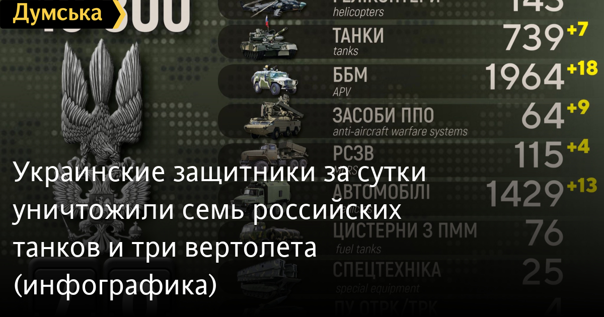 Один самолет, три вертолета и семь танков российских нацистов уничтожили за минувшие сутки Силы обороны Украины.