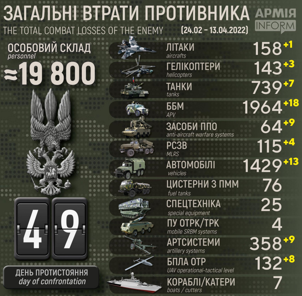 Всего с начала полномасштабного вторжения потери противника составили: примерно 19,8 тыс. солдат и офицеров, 739 танков, 1964 ББМ, 358 артсистем, 115 РСЗО, 64 средства ПВО, 158 самолетов, 143 вертолета, 1429 автомобилей, семь кораблей и катеров, 76 цистерн с ГСМ, 132 БПЛА, 25 единиц спецтехники и четыре пусковые установки оперативно-тактических ракетных комплексов.