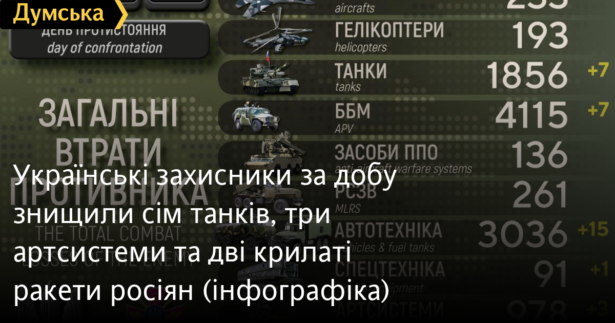 Всього з початку повномасштабної війни українські захисники знищили приблизно: особового складу ‒ близько 43 400 (+200) осіб ліквідовано, танків ‒ 1 856 (+7) од, бойових броньованих машин ‒ 4 115 (+7) од, артилерійських систем – 978 (+3) од, РСЗВ ‒ 261 (+0) од, засоби ППО ‒ 136 (+0) од, літаків – 233 (+0) од, гелікоптерів – 193 (+0) од, БПЛА оперативно-тактичного рівня ‒ 779 (+1), крилаті ракети ‒ 187 (+2), кораблі / катери ‒ 15 (+0) од, автомобільної техніки та автоцистерн ‒ 3 036 (+15) од, спеціальна техніка ‒ 91 (+1).