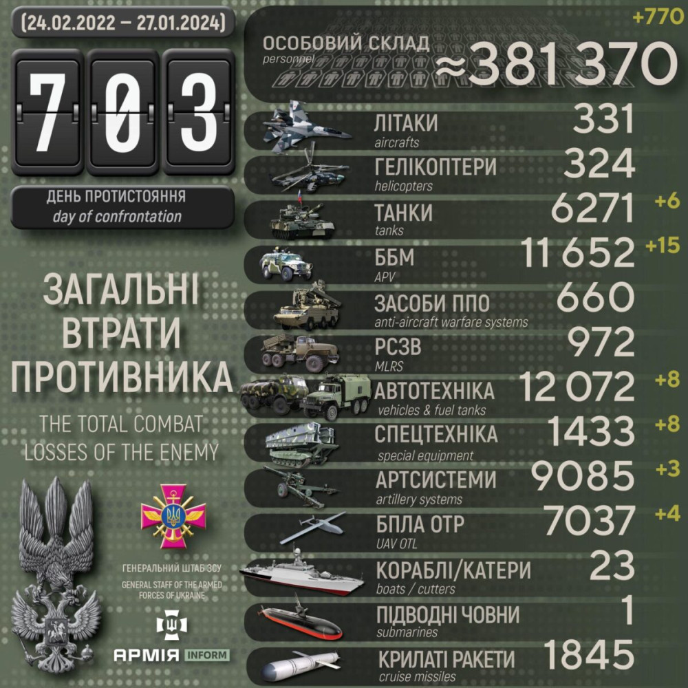 Усього з початку повномасштабного вторгнення втрати ворога склали: