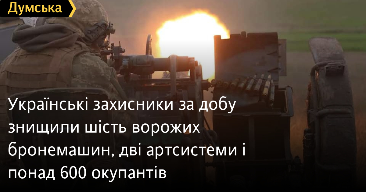 Крім того, за даними Генерального штабу Збройних сил України, наші захисники також знищили шість бойових броньованих машин, вісім БПЛА оперативно-тактичного рівня, шість одиниць автомобільної техніки і дві одиниці спецтехніки.