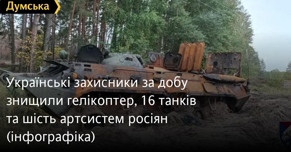 Гелікоптер, 16 танків та шість артсистем російських нацистів знищили за минулу добу Сили оборони України.