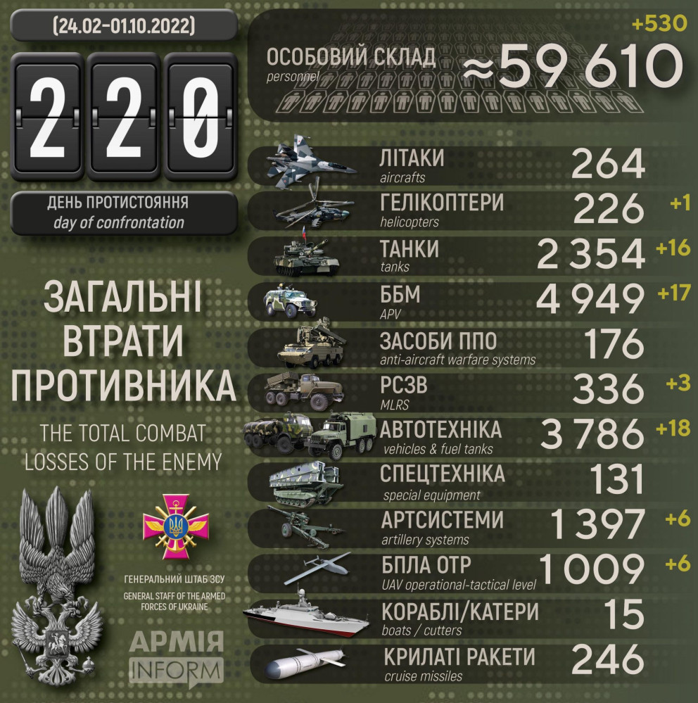 Всього з початку повномасштабної війни українські захисники знищили приблизно: особового складу ‒ близько 59610 (+530) осіб ліквідовано, танків ‒ 2354 (+16) од, бойових броньованих машин ‒ 4949(+17) од, артилерійських систем – 1397 (+6) од, РСЗВ – 336 (+3) од, засоби ППО ‒ 176 (+1) од, літаків – 264 од (+0), гелікоптерів – 226 (+1) од, БПЛА оперативно-тактичного рівня – 1009 (+6), крилаті ракети ‒ 246 (+0), кораблі /катери ‒ 15 (+0) од, автомобільної техніки та автоцистерн – 3786 (+18) од, спеціальна техніка ‒ 131 (+0).