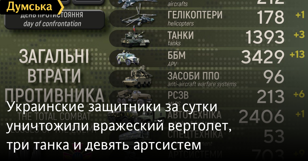 Силы обороны уничтожили вертолет рф, три танка и девять артсистем. Около 140 российских нацистов убиты или в плену.