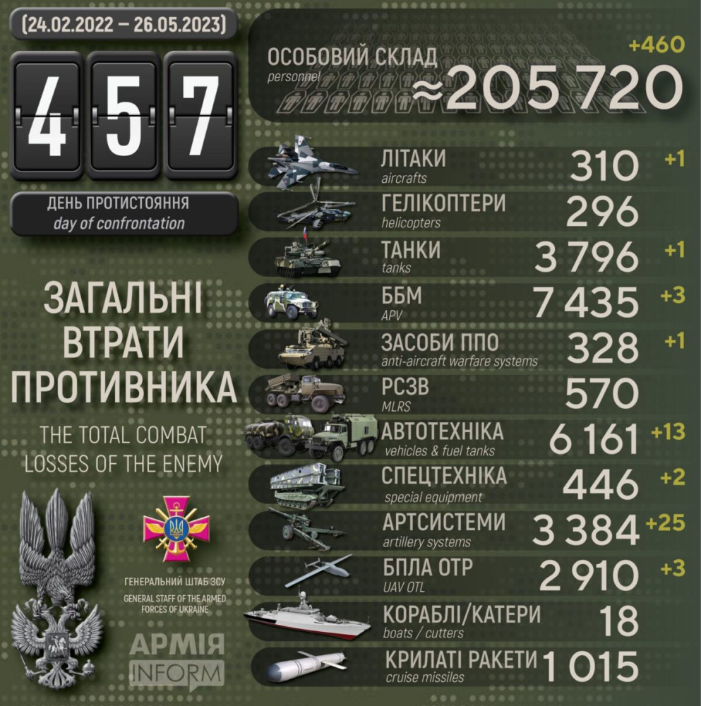 Крім того, за даними Генерального штабу Збройних сил України, наші захисники також знищили три бойові броньовані машини, 25 артсистем, один засіб ППО, три БПЛА оперативно-тактичного рівня, 13 одиниць автомобільної техніки і дві одиниці спецтехніки.