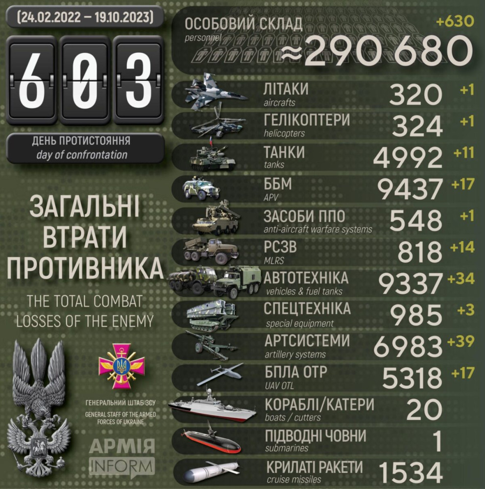 Крім того, за даними Генерального штабу Збройних сил України, наші захисники також знищили 11 танків, 39 артсистем, 17 бойових броньованих машин, чотири РСЗВ, один засіб ППО, 17 БПЛА оперативно-тактичного рівня, 34 одиниці автомобільної техніки і три одиниці спецтехніки.