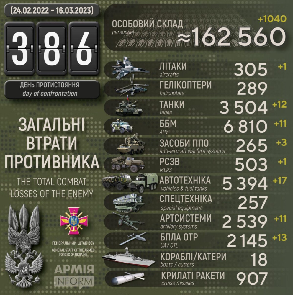 Усього з початку повномасштабного вторгнення втрати ворога склали: