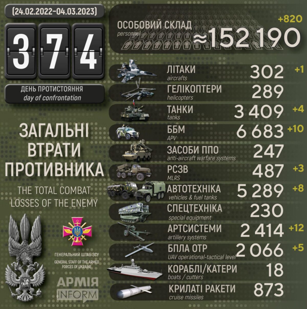 Усього з початку повномасштабного вторгнення втрати ворога склали: