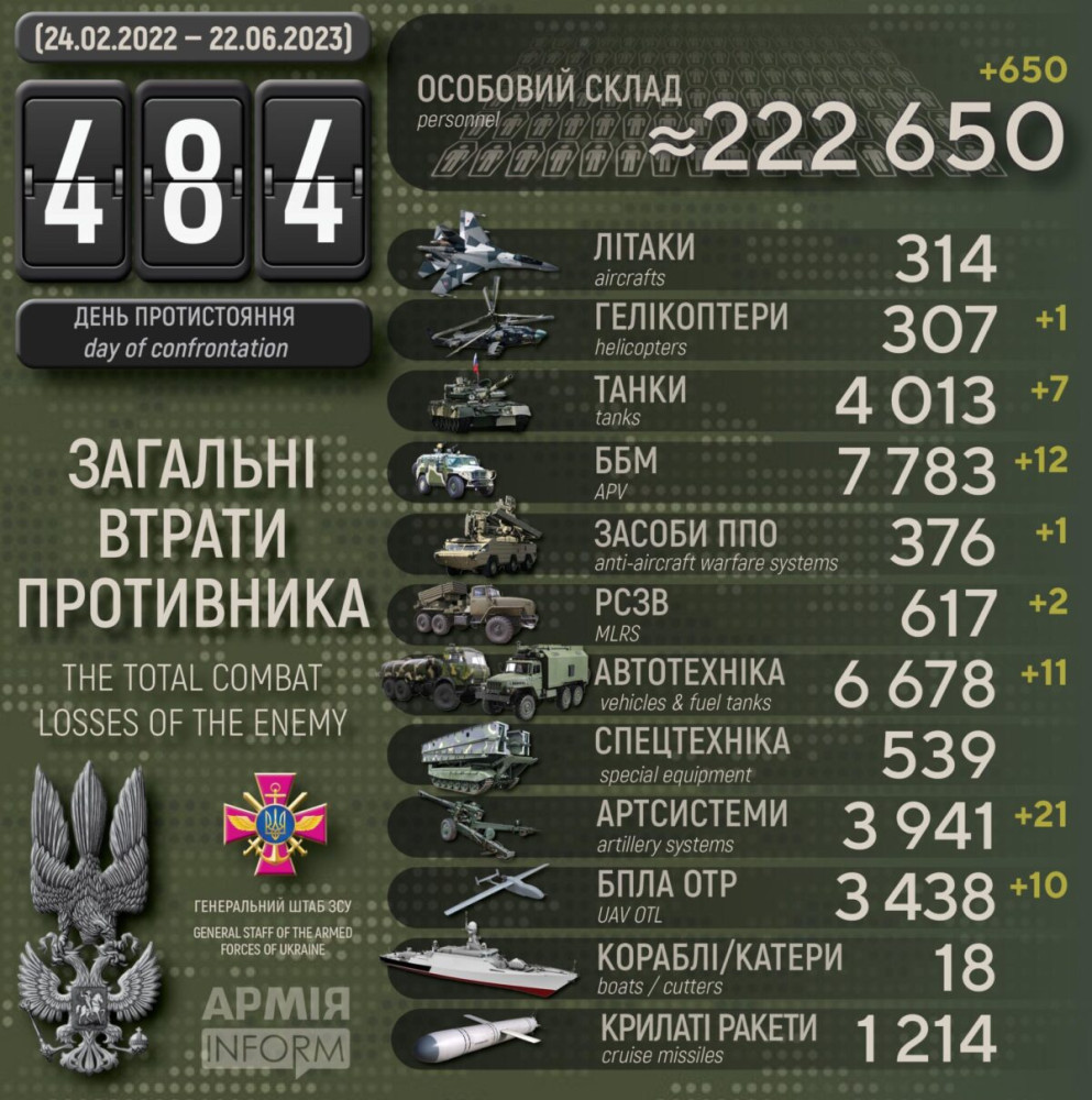 Крім того, за даними Генерального штабу Збройних сил України, наші захисники також знищили 12 бойових броньованих машин, 21 артсистему, дві РСЗВ, один засіб ППО, десять БПЛА оперативно-тактичного рівня та 11 одиниць автомобільної техніки.