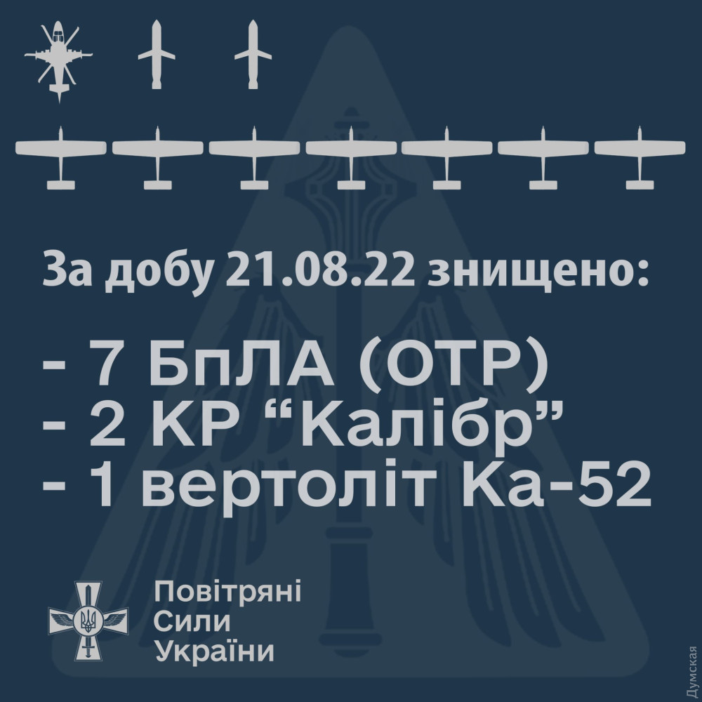 Українські підрозділи протиповітряної оборони 21 серпня «приземлили» ворожий гелікоптер Ка-52 та семеро безпілотників «Орлан», а також збили дві ракети «Калібр».