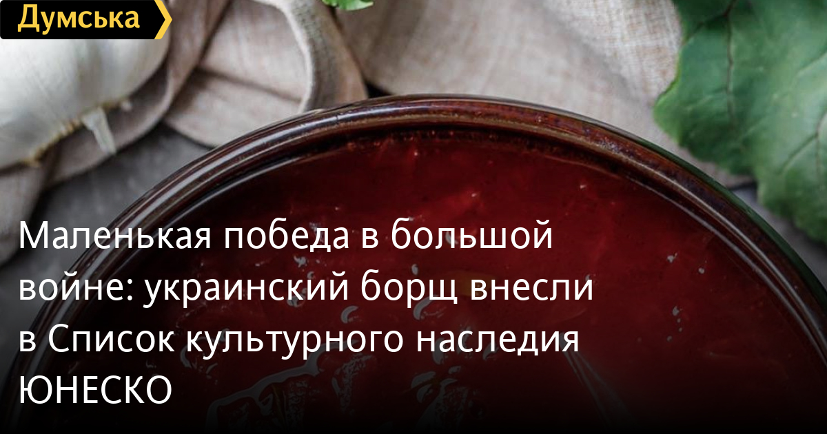 «Сражение за борщ было начато еще до войны. И сколько бы Захарова ни рассказывала, что «книги по кулинарии запрещались, а рецепт блюда держали в тайне и запрещали готовить» и вообще наш борщ — это «проявление экстремизма и нацизма», это «проявление экстремизма» теперь официально украинское, и официально охраняемое ЮНЕСКО», — написал Ткаченко.