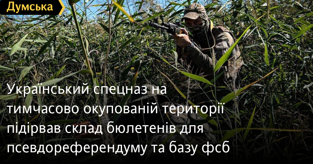 Спецназ Головного управління розвідки Міністерства оборони України проникнув у тимчасово окуповане місто Кам'янка-Дніпровська у Запорізькій області та підірвав там склад, у якому зберігалися бюлетені для проведення псевдореферендуму про приєднання регіону до росії.