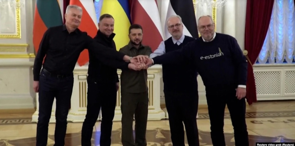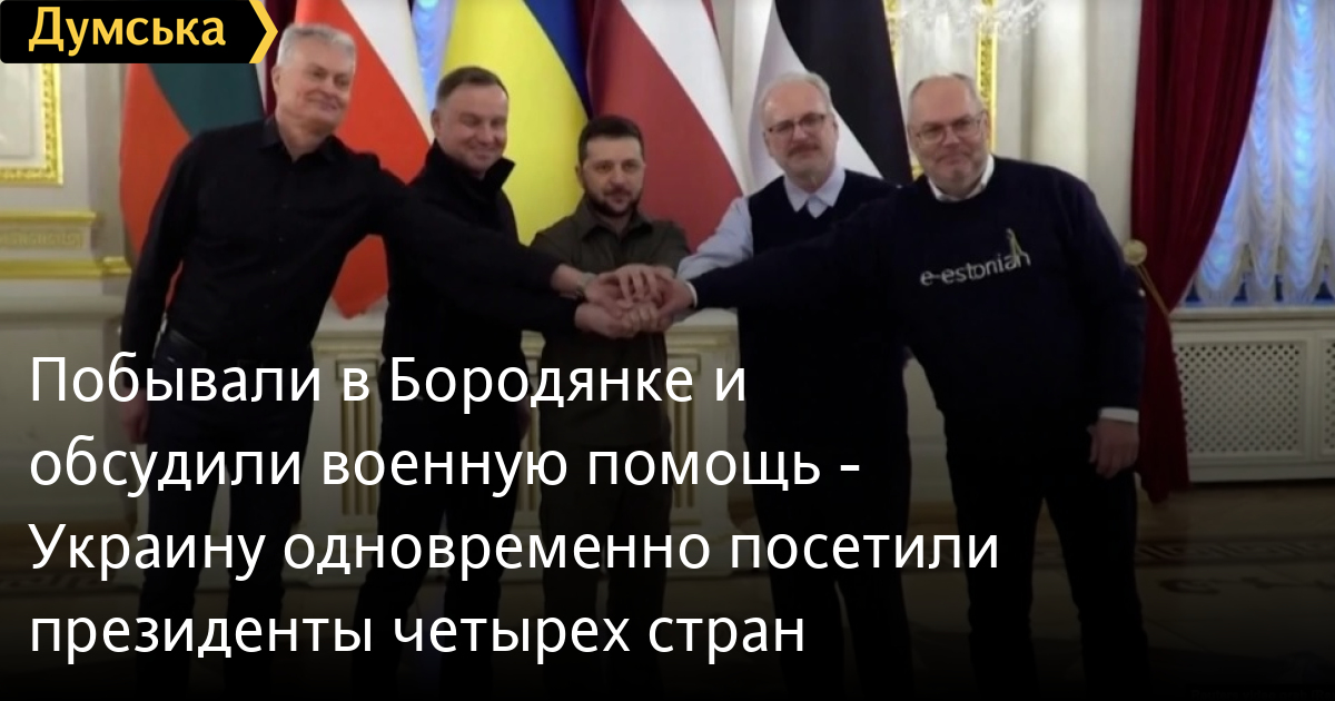 Президенты сразу четырех стран – Польши, Латвии, Литвы и Эстонии — прибыли в Киев с визитом 13 апреля. Лидеры стран-партнеров выразили свою солидарность с Украиной, обсудили военную помощь, санкции против России и вступление Украины в ЕС.