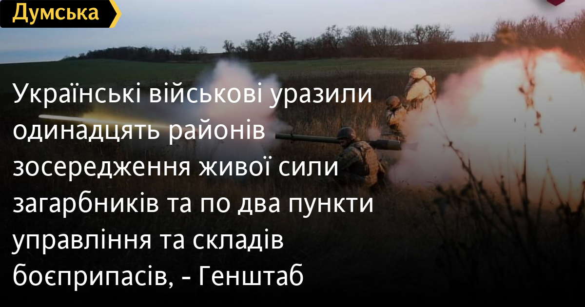 Українські військові уразили одинадцять районів зосередження живої сили загарбників та по два пункти управління та складів боєприпасів, — ГенштабОдинадцять районів зосередження живої сили загарбників та по два пункти управління та складів боєприпасів уразили Сили оборони протягом 24 годин. Про успіхи бойового дня повідомив в ранковому зведенні Генеральний штаб Збройних сил України. Українська авіація протягом доби завдала 13 ударів по районах зосередження особового складу й ОВТ та удар по позиціях зенітно-ракетного комплексу противника. Підтверджено збиття дев'яти ворожих безпілотників різних типів. Підрозділи ракетних військ і артилерії Сил оборони України уразили два пункти управління та стільки ж складів боєприпасів й одинадцять районів зосередження живої сили загарбників. Через значні втрати російських військ, окупаційна влада продовжує перепрофілювання лікарень Луганської області у військові шпиталі. Так сталося з медзакладами в Біловодську та Марківці. 19 грудня до хірургічного відділення районної лікарні в Старобільську, яке облаштоване під військовий шпиталь, привезли близько 100 поранених військовослужбовців противника. Противник продовжує зазнавати втрат. 22 грудня в Запорізькій області Сили оборони знищили дві артилерійські системи з боєкомплектом. Понад 70 військовослужбовців противника отримали поранення. Інформація щодо ліквідованих окупантів уточнюється. СМЕРТЬ РОСІЙСЬКИМ ОКУПАНТАМ! Помітили помилку? Виділяйте слова з помилкою та натискайте control-enter |