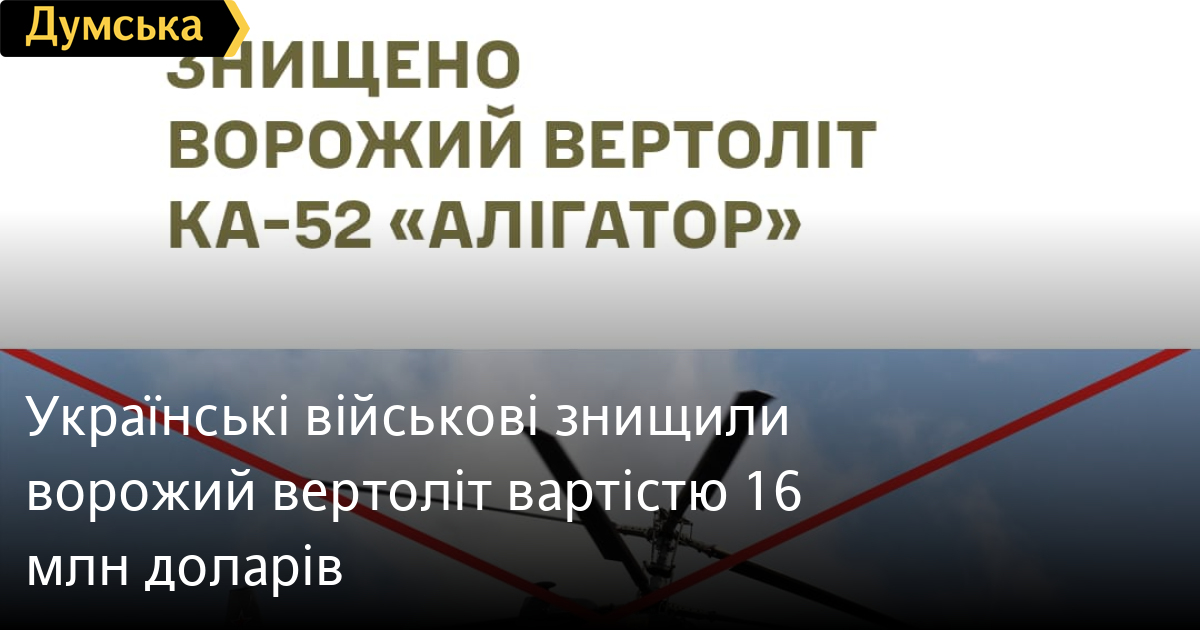 Українські військові знищили ворожий вертоліт вартістю 16 млн доларівВорожий вертоліт Ка-52 «Алігатор» знищили 13 травня воїни 47 окремої механізованої бригади. Як повідомили в командуванні Сухопутних військ, вартість одного такого гелікоптера складає 16 млн доларів. «Дякуємо бійцям зенітного ракетно-артилерійського дивізіону за роботу. Працюємо далі!» — заявили в командуванні. СМЕРТЬ РОСІЙСЬКИМ ОКУПАНТАМ! Помітили помилку? Виділяйте слова з помилкою та натискайте control-enter |