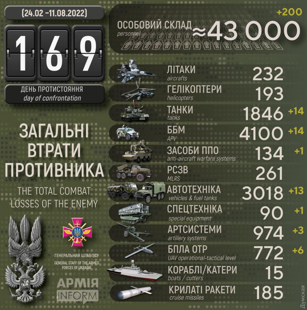 Найбільших втрат противник зазнав на донецькому напрямку.Загальні бойові втрати противника з 24.02 по 11.08 орієнтовно склали:особового складу близько 43 000 (+200) осіб ліквідовано,танків ‒ 1 846 (+14) од,бойових броньованих машин ‒ 4 100 (+14) од,артилерійських систем – 974 (+3) од,РСЗВ – 261 (+0) од,засоби ППО – 134 (+1) од,літаків – 232 (+0) од,гелікоптерів – 193 (+0) од,БПЛА оперативно-тактичного рівня – 772 (+6),крилаті ракети – 185 (+0),кораблі /катери – 15 (+0) од,автомобільної техніки та автоцистерн – 3 018 (+13) од,спеціальна техніка – 90 (+1).