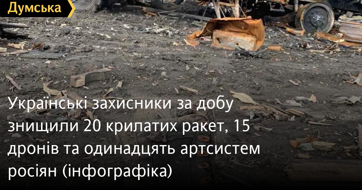 Українські захисники за добу знищили 20 крилатих ракет, 15 дронів та одинадцять артсистем росіян (інфографіка)Одинадцять артсистем та 20 крилатих ракет, 15 безпілотників російських нацистів знищили за минулу добу Сили оборони України. 270 окупантів убито або в полоні, повідомили в українському Генштабі. Також противник втратив танк, 19 бойових броньованих машин, дві реактивні системи залпового вогню, засіб ППО та 11 одиниць автомобільної техніки та автоцистерн. Найбільших втрат противник зазнав на бахмутському та авдіївському напрямках. Всього з початку повномасштабної війни українські захисники знищили приблизно: особового складу ‒ близько 63380 (+270) осіб ліквідовано, танків ‒ 2505 (+1) од, бойових броньованих машин ‒ 5181 (+19) од, артилерійських систем – 1507 (+11) од, РСЗВ – 355 (+2) од, засоби ППО ‒ 182 (+1) од, літаків – 268 (+0) од, гелікоптерів – 235 (+0) од, БПЛА оперативно-тактичного рівня – 1129 (+15), крилаті ракети ‒ 215 (+20), кораблі /катери ‒ 15 (+0) од, автомобільної техніки та автоцистерн – 3927 (+11) од, спеціальна техніка ‒ 136 (+0). СМЕРТЬ РОСІЙСЬКИМ ОКУПАНТАМ! Помітили помилку? Виділяйте слова з помилкою та натискайте control-enter |