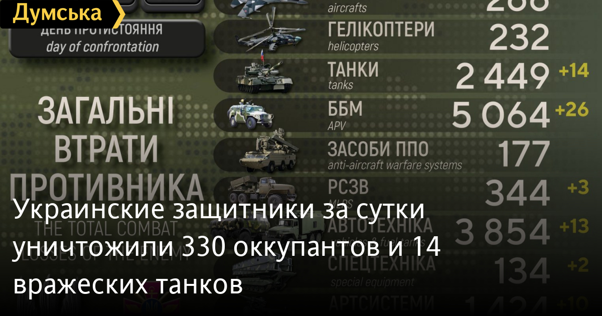 Українські захисники за добу знищили 330 окупантів і 14 ворожих танків330 осіб, 14 танків і три РСЗВ втратили окупанти за минулу добу в Україні. Крім того, за даними Генерального штабу Збройних сил України, наші захисники також знищили 26 бойових броньованих машин, десять артсистем, 15 БПЛА оперативно-тактичного рівня, 13 одиниць автомобільної техніки і дві одиниці спецтехніки. Усього з початку повномасштабного вторгнення втрати ворога склали: особового складу — 61 330 осіб; танків ‒ 2449 одиниць; бойових броньованих машин ‒ 5064 одиниці; артилерійських систем – 1424 одиниці; РСЗВ – 344 одиниці; засоби ППО ‒ 177 одиниць; літаків – 266 одиниць; гелікоптерів – 232 одиниці; БПЛА оперативно-тактичного рівня – 1047; крилаті ракети ‒ 246; кораблі /катери ‒ 15 одиниць; автомобільної техніки та автоцистерн – 3854 одиниці; спеціальна техніка ‒ 134. СМЕРТЬ РОСІЙСЬКИМ ОКУПАНТАМ! Помітили помилку? Виділяйте слова з помилкою та натискайте control-enter |