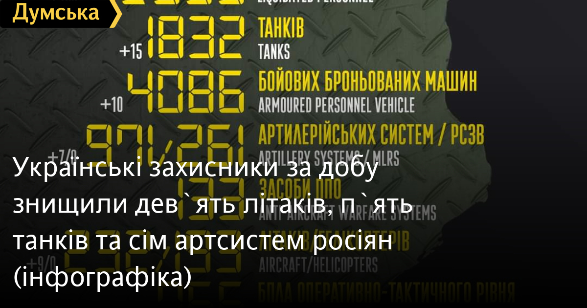 Дев'ять літаків, п'ять танків та сім артсистем російських нацистів знищили за останню добу Сили оборони України.