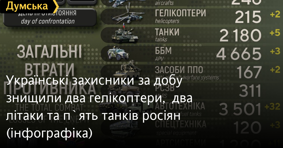 Два гелікоптери, два літаки та п'ять танків російських нацистів знищили за минулу добу Сили оборони України.