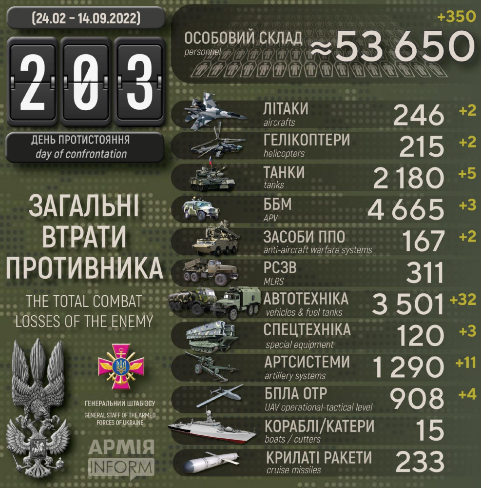 Всього з початку повномасштабної війни українські захисники знищили приблизно: особового складу – близько 53 650 (+350) осіб, танків ‒ 2 180 (+5) од, бойових броньованих машин ‒ 4 665 (+3) од, артилерійських систем – 1 290 (+11) од, РСЗВ – 311 (+0) од, засоби ППО – 167 (+2) од, літаків – 246 (+2) од, гелікоптерів – 215 (+2) од, БПЛА оперативно-тактичного рівня – 908 (+4), крилаті ракети – 233 (+0), кораблі /катери – 15 (+0) од, автомобільної техніки та автоцистерн – 3 501 (+32) од, спеціальна техніка – 120 (+3).