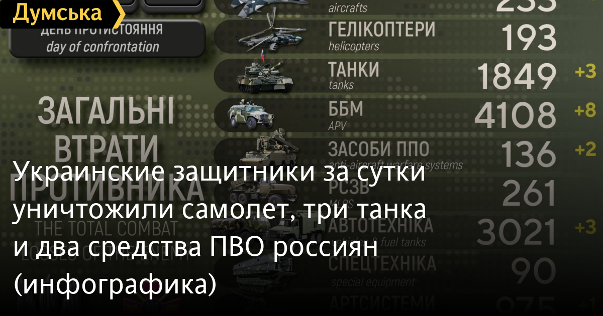 Українські захисники за добу знищили літак, три танки та два засоби ППО росіян (інфографіка)Літак, три танки та два засоби протиповітряної оборони російських нацистів знищили за останню добу Сили оборони України. Втрати особового складу окупаційних військ становили 200 осіб, повідомили в українському Генштабі. Також противник втратив вісім бойових броньованих машин, одну артсистему, шість безпілотних літальних апаратів оперативно-тактичного рівня та три одиниці автомобільної техніки та автоцистерн. СМЕРТЬ РОСІЙСЬКИМ ОКУПАНТАМ! Помітили помилку? Виділяйте слова з помилкою та натискайте control-enter |