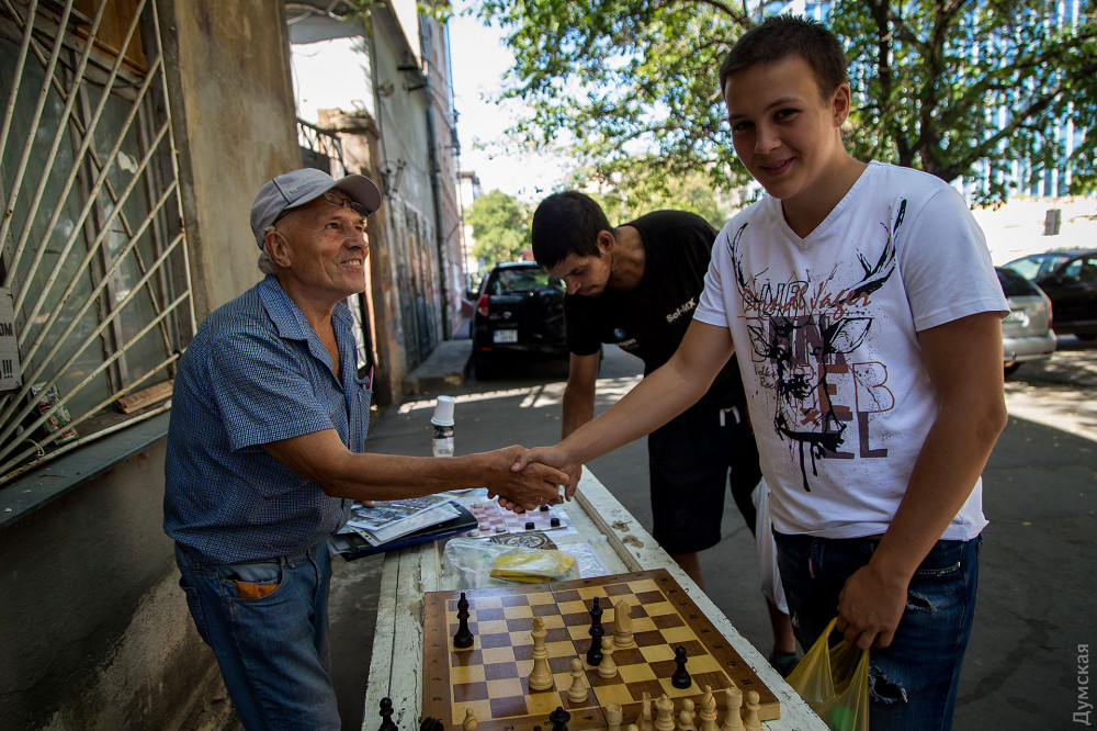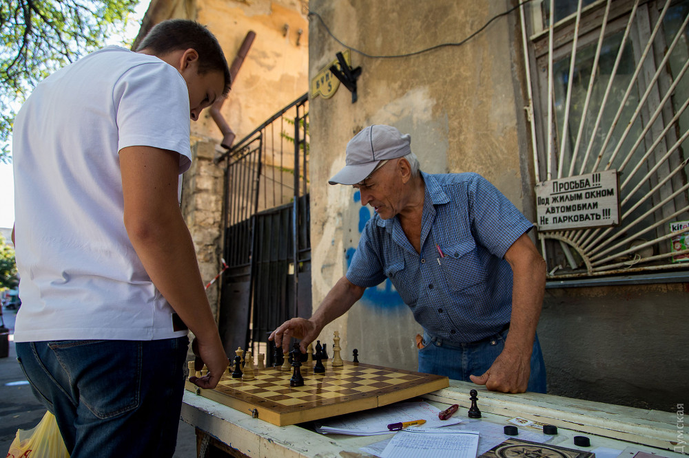 Но Одесса не была бы Одессой, не предложи она чего-то интересного. Так, на улице Бунина вот уже несколько недель работает самая настоящая уличная школа шахмат.