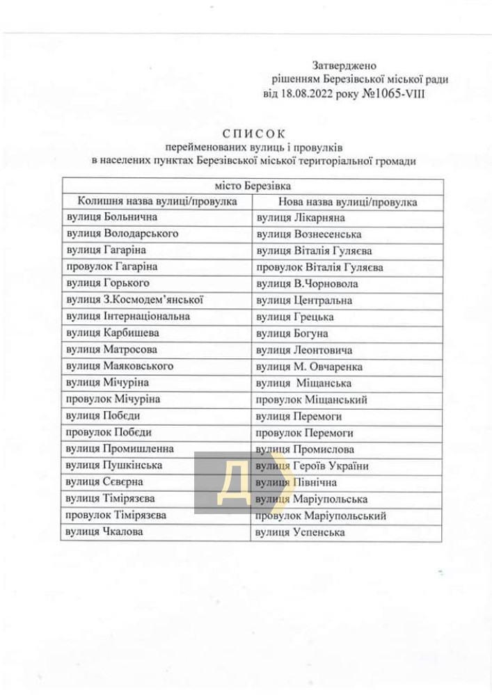 Так, вулиця Горького стала Чорновола, Міжнародна – Грецькою, Пушкінська – Героїв України, Тимірязєва (і однойменний провулок) – Маріупольською.