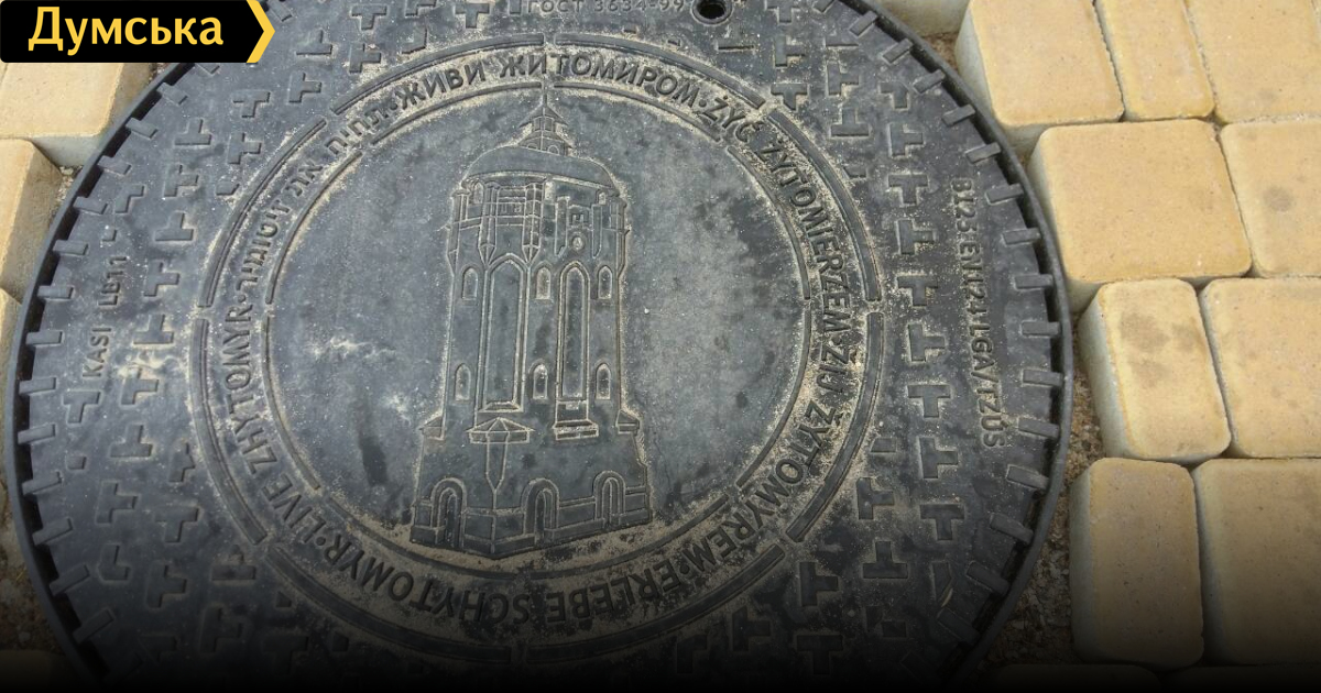 На люках изображены местная водонапорная башня и надпись «Живи Житомиром» на шести языках.