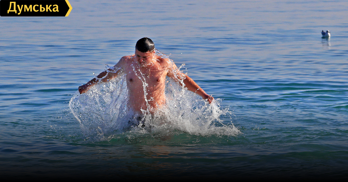 Веселье и позитив царили сегодня утром на пляже «Золотой берег», что на 16-ой станции Большого Фонтана. Сегодня утром в Одессе было 19 градусов мороза, у моря было существенно теплее — около минус десяти.