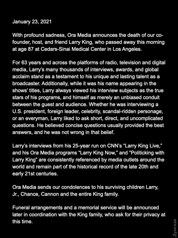 Легендарный американский телеведущий и журналист Ларри Кинг скончался сегодня на 87-м году жизни. Об этом стало известно из сообщения на его странице в Twitter. Он умер в больнице в Лос-Анджелесе, куда попал еще в начале января с коронавирусом. В 2019 году телеведущий перенес третий в жизни инфаркт, а летом 2020-го года похоронил двоих детей, который умерли с разницей в несколько недель. 28 июля от сердечного приступа скончался его сын, 65-летний Энди Кинг, а 20 августа от рака легких 52-летняя дочь Чайа. Кинг родился 19 ноября 1933 года в Нью-Йорке. Всемирную известность ему принесло ток-шоу Larry King Live, которое он вел на телеканале CNN на протяжении 25 лет: с 1985 года по 2010 год. СМЕРТЬ РОССИЙСКИМ ОККУПАНТАМ! Заметили ошибку? Выделяйте слова с ошибкой и нажимайте control-enter |