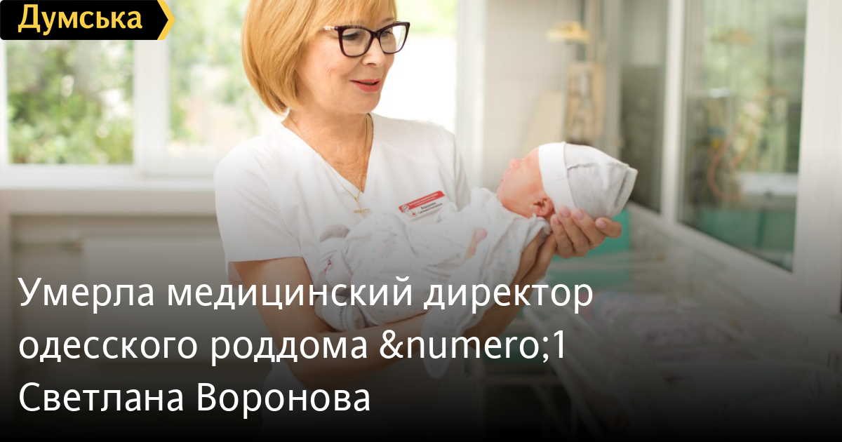 Померла медичний директор одеського пологового будинку №1 Світлана ВороноваМедичний директор (начмед) одеського пологового будинку №1 Світлана Воронова померла внаслідок важкої та нетривалої хвороби. Про смерть керівника медустанови повідомили її колеги. Воронова була досвідченим акушером-гінекологом, 1979 року закінчила одеський Медін, після чого понад 40 років присвятила себе обраній професії — почала кар'єру в шостому пологовому будинку, а потім 22 роки працювала в першому. У 2022 році Світлана Воронова за багаторічну та успішну працю була удостоєна почесної відзнаки одеського міського голови. У 2015 році отримала почесне звання «Кращий працівник охорони здоров'я Одеси». Помітили помилку? Виділяйте слова з помилкою та натискайте control-enter |