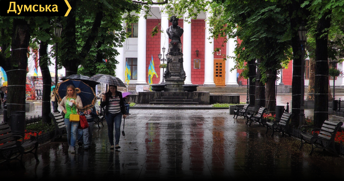 Одесситы и первые туристы, не испугавшиеся непогоды, гуляют по умытому дождем городу.