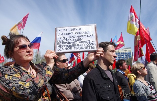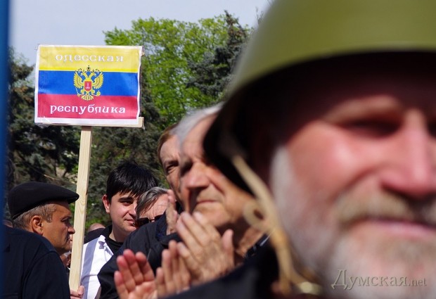 Митинг получился довольно унылым. Из нового — плакаты с на рисованными флагами «одесской республики».