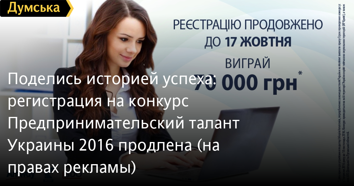 Оргкомитет конкурса «Предпринимательский талант Украины 2016» принял решение продлить регистрацию участниц до 17 октября, чтобы все желающие успели подать свои работы. Поспешите поделиться со всей Украиной собственной историей успеха и выиграть ценные подарки.