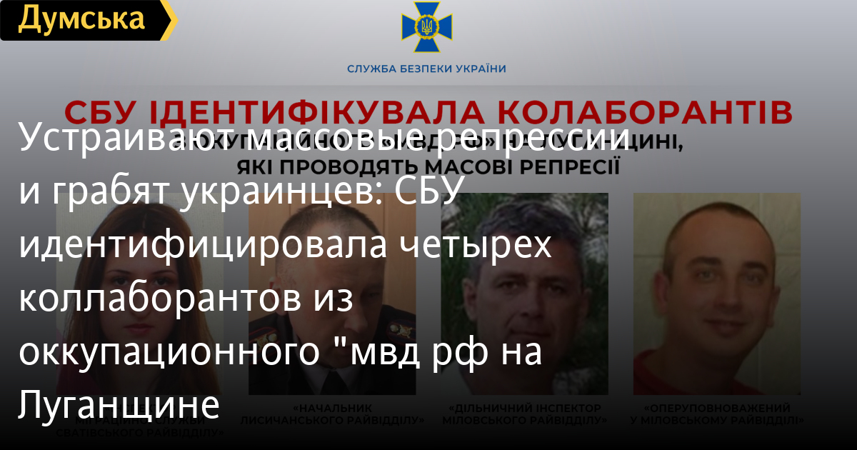 Проводять масові репресії та грабують українців: СБУ ідентифікувала чотирьох колаборантів з окупаційного «мвд рф» на ЛуганщиніОсоби чотирьох колаборантів, які вступили до створених окупантами каральних підрозділів «мвд» на захопленій частині Луганщини, встановили українські спецслужби. Серед них – очільник так званого «Лисичанского городского отдела министерства внутренних дел «лнр», повідомили у СБУ. Він за допомогою масових репресій та незаконних затримань нав’язує жителям окупаційний режим та придушує рух опору на сході України. Місцевий житель, який ще у 2014 році приєднався до терористів «лнр», застосовує психологічний тиск, насильство та погрози фізичної розправи. Зафіксовано факти викрадення людей та пограбування їхнього майна. Спочатку його призначили «заместителем начальника горотдела мвд» у тимчасово захопленій Кадіївці. У вересні цього року він погодився очолити новостворений окупаційний орган у Лисичанську. Крім того, ідентифіковано «оперуповноваженого» та «дільничних інспекторів» у Старобільському та Сватівському районах, які залякували місцевих та влаштовували справжнісінькі нальоти, після яких у людей зникають гроші та речі. Наразі слідчі Служби безпеки повідомили фігурантам про підозри у колабораційній діяльності. СБУ встановила адреси перебування, маршрути переміщення та перелік зв’язків колаборантів. Тривають заходи для їх притягнення до відповідальності за злочини проти України. СМЕРТЬ РОСІЙСЬКИМ ОКУПАНТАМ! Помітили помилку? Виділяйте слова з помилкою та натискайте control-enter |