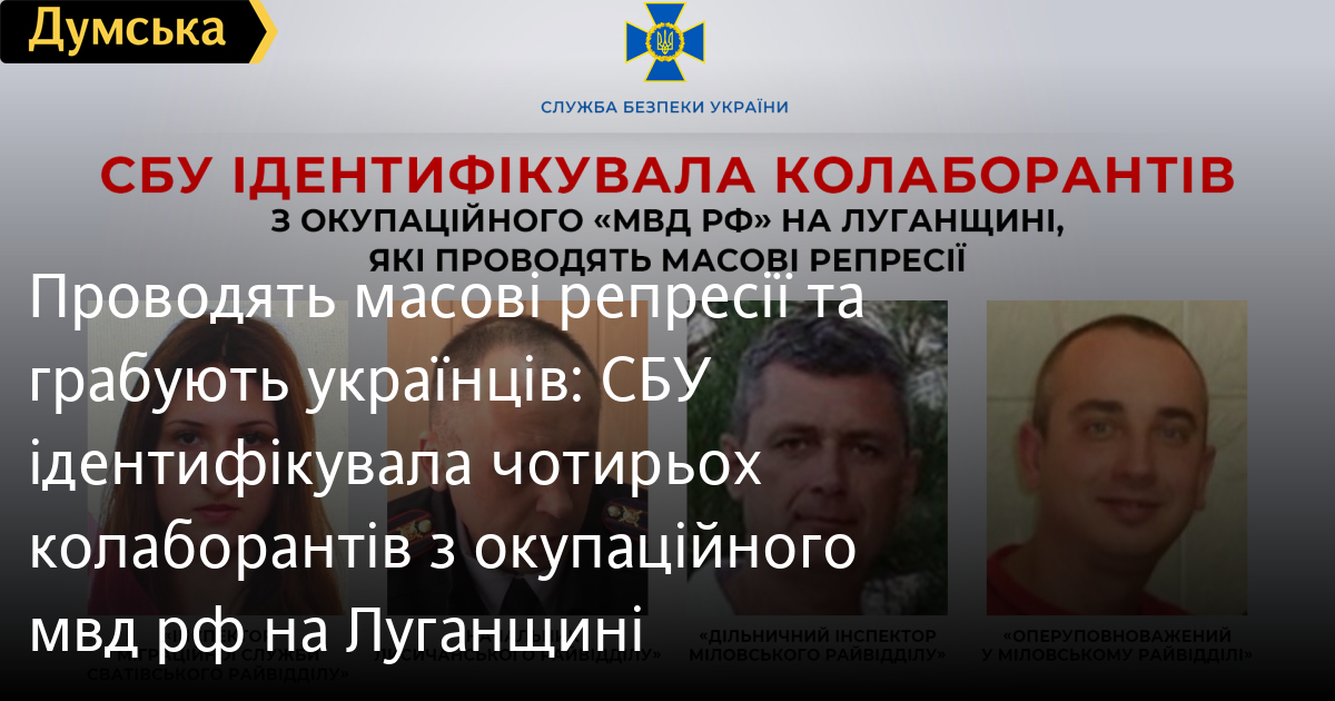 Проводять масові репресії та грабують українців: СБУ ідентифікувала чотирьох колаборантів з окупаційного «мвд рф» на ЛуганщиніОсоби чотирьох колаборантів, які вступили до створених окупантами каральних підрозділів «мвд» на захопленій частині Луганщини, встановили українські спецслужби. Серед них – очільник так званого «Лисичанского городского отдела министерства внутренних дел «лнр», повідомили у СБУ. Він за допомогою масових репресій та незаконних затримань нав’язує жителям окупаційний режим та придушує рух опору на сході України. Місцевий житель, який ще у 2014 році приєднався до терористів «лнр», застосовує психологічний тиск, насильство та погрози фізичної розправи. Зафіксовано факти викрадення людей та пограбування їхнього майна. Спочатку його призначили «заместителем начальника горотдела мвд» у тимчасово захопленій Кадіївці. У вересні цього року він погодився очолити новостворений окупаційний орган у Лисичанську. Крім того, ідентифіковано «оперуповноваженого» та «дільничних інспекторів» у Старобільському та Сватівському районах, які залякували місцевих та влаштовували справжнісінькі нальоти, після яких у людей зникають гроші та речі. Наразі слідчі Служби безпеки повідомили фігурантам про підозри у колабораційній діяльності. СБУ встановила адреси перебування, маршрути переміщення та перелік зв’язків колаборантів. Тривають заходи для їх притягнення до відповідальності за злочини проти України. СМЕРТЬ РОСІЙСЬКИМ ОКУПАНТАМ! Помітили помилку? Виділяйте слова з помилкою та натискайте control-enter |
